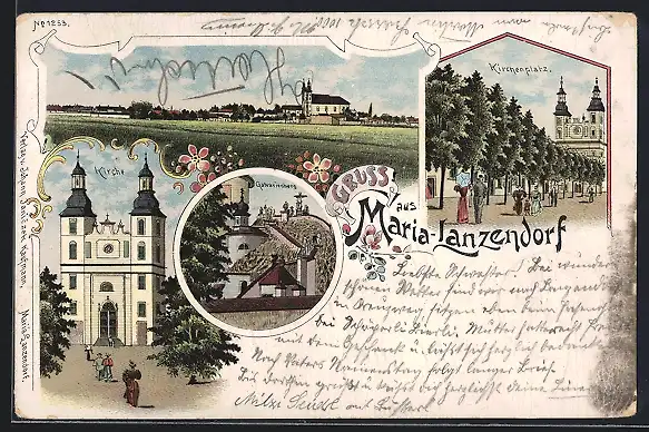 Lithographie Maria-Lanzendorf, Kirche, Galvarienberg, KIrchenplatz, Totalansicht aus der Ferne