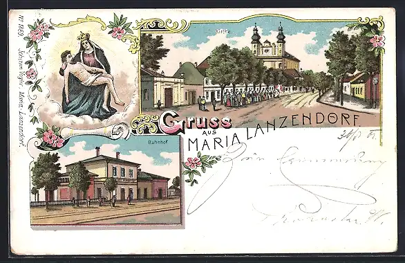 Lithographie Maria Lanzendorf, Prozession an der Kirche, Bahnhof, Pietà