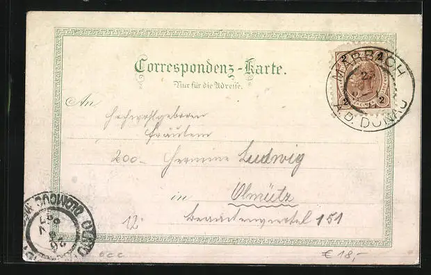 Personenbezogene Daten auf der Rückseite der Karte wurden durch blauen Textmarker unkenntlich gemacht. Die blauen Stellen sind auf die Vorderseite durchgeweicht und wirken sich negativ auf das Postkartenfoto aus