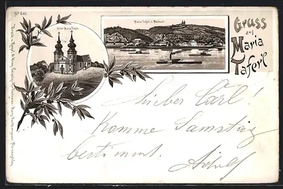 Lithographie Maria Taferl, Teilansicht mit Marbach, Kirche