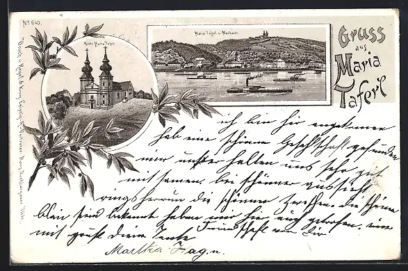 Lithographie Maria Taferl, Teilansicht mit Marbach, Kirche Maria Taferl