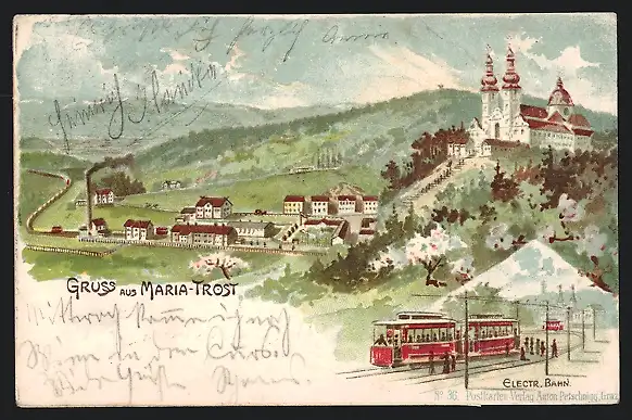 Lithographie Maria-Trost, Panorama mit Strassenbahn