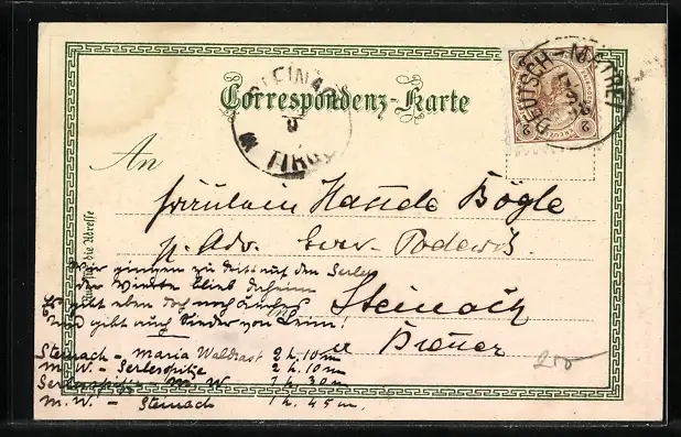 Personenbezogene Daten auf der Rückseite der Karte wurden durch blauen Textmarker unkenntlich gemacht. Die blauen Stellen sind auf die Vorderseite durchgeweicht und wirken sich negativ auf das Postkartenfoto aus