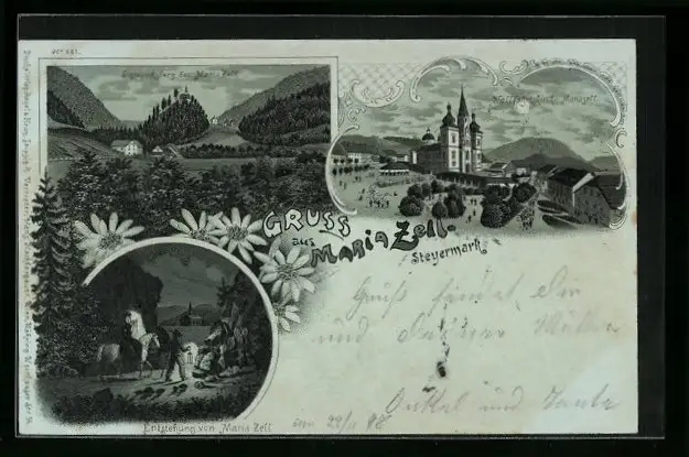Lithographie Maria Zell, Blick zur Wallfahrtskirche, Sigmundsberg