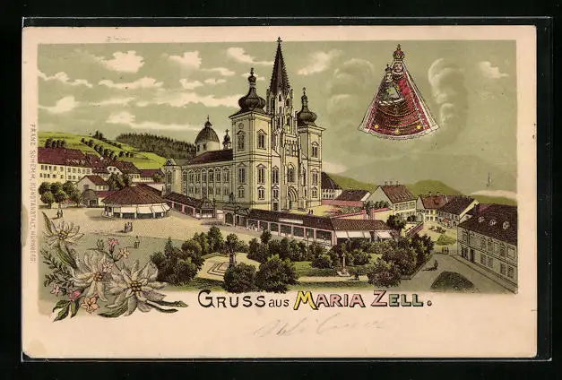 Lithographie Maria Zell, Ortspartie mit Kirche, Gnadenmutter