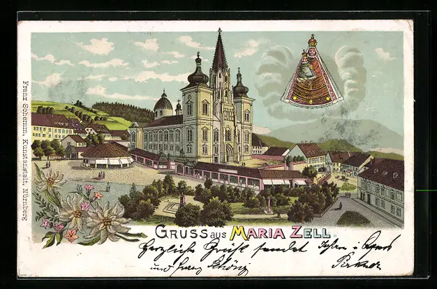 Lithographie Maria Zell, Ortspartie mit Kirche, Gnadenmutter