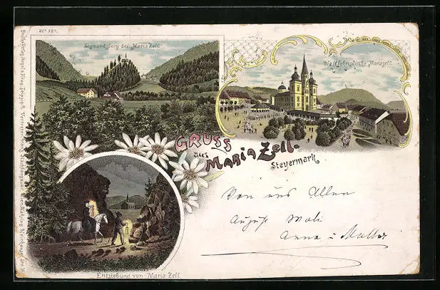 Lithographie Maria Zell, Wallfahrtskirche, Sigmundsberg