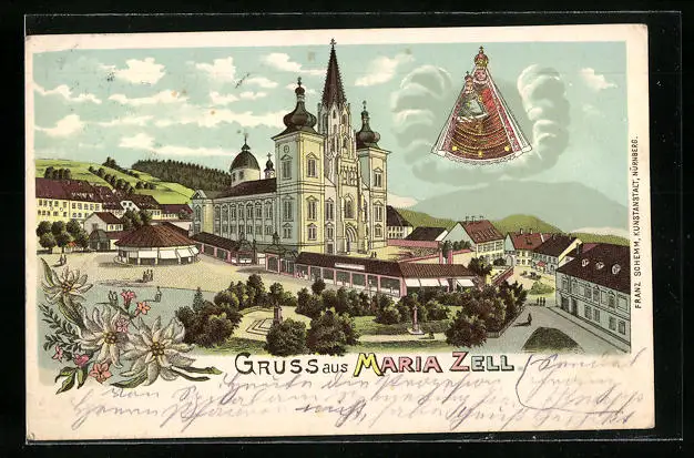 Lithographie Maria Zell, Wallfahrtskirche und Gnadenmutter