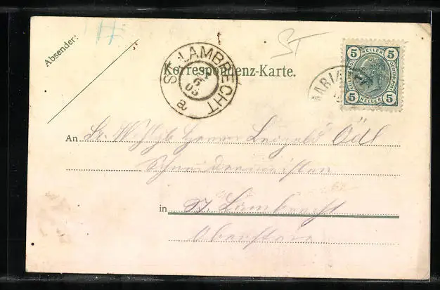 Personenbezogene Daten auf der Rückseite der Karte wurden durch blauen Textmarker unkenntlich gemacht. Die blauen Stellen sind auf die Vorderseite durchgeweicht und wirken sich negativ auf das Postkartenfoto aus