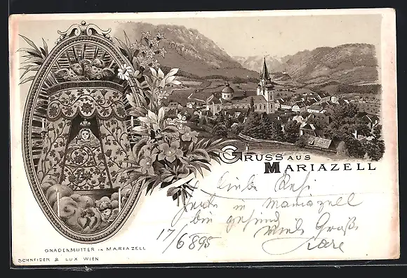 Lithographie Mariazell, Ortsansicht, Abbildung der Gnadenmutter