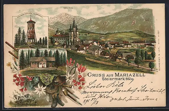 Lithographie Mariazell, Schutzhaus, Erzh. Franz Karls-Höhe, Ortspanorama mit Kirche
