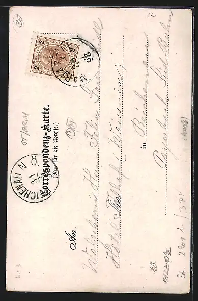 Personenbezogene Daten auf der Rückseite der Karte wurden durch blauen Textmarker unkenntlich gemacht. Die blauen Stellen sind auf die Vorderseite durchgeweicht und wirken sich negativ auf das Postkartenfoto aus