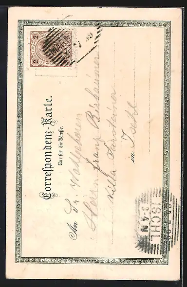 Personenbezogene Daten auf der Rückseite der Karte wurden durch blauen Textmarker unkenntlich gemacht. Die blauen Stellen sind auf die Vorderseite durchgeweicht und wirken sich negativ auf das Postkartenfoto aus