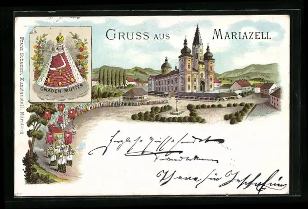 Lithographie Mariazell, Wallfahrtskirche mit Prozession und Gnaden-Mutter