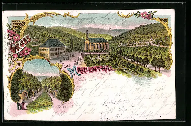 Lithographie Marienthal im Rheingau, Ortspartie mit Kirche