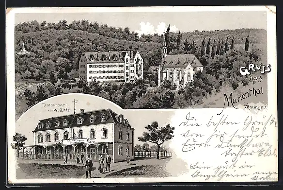 Lithographie Marienthal im Rheingau, Restaurant Gietz und die Kirche