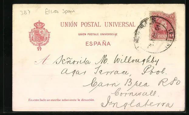 Personenbezogene Daten auf der Rückseite der Karte wurden durch blauen Textmarker unkenntlich gemacht. Die blauen Stellen sind auf die Vorderseite durchgeweicht und wirken sich negativ auf das Postkartenfoto aus