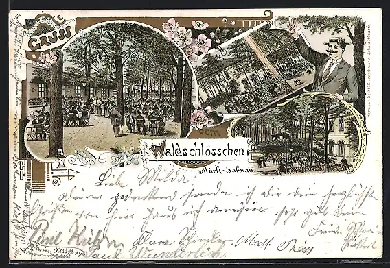 Lithographie Mark-Sahnau, Waldschlösschen mit Garten