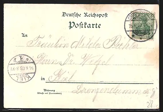 Personenbezogene Daten auf der Rückseite der Karte wurden durch blauen Textmarker unkenntlich gemacht. Die blauen Stellen sind auf die Vorderseite durchgeweicht und wirken sich negativ auf das Postkartenfoto aus