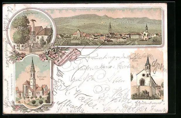 Lithographie Markdorf, Ortsansicht, Kriegerdenkmal, Kirchen