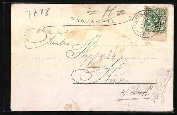 Personenbezogene Daten auf der Rückseite der Karte wurden durch blauen Textmarker unkenntlich gemacht. Die blauen Stellen sind auf die Vorderseite durchgeweicht und wirken sich negativ auf das Postkartenfoto aus