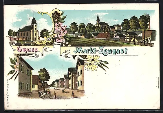 Lithographie Markt-Leugast, Ortspartie, Kirche, Totalansicht