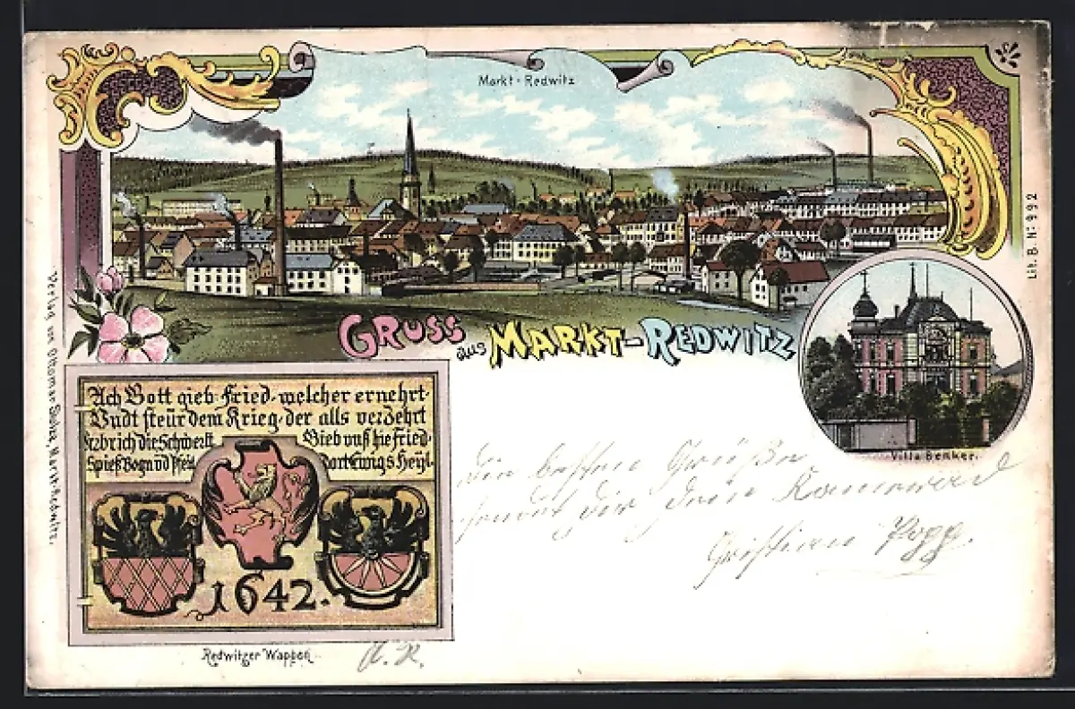 Lithographie Markt-Redwitz, Villa Benker mit Ortsansicht