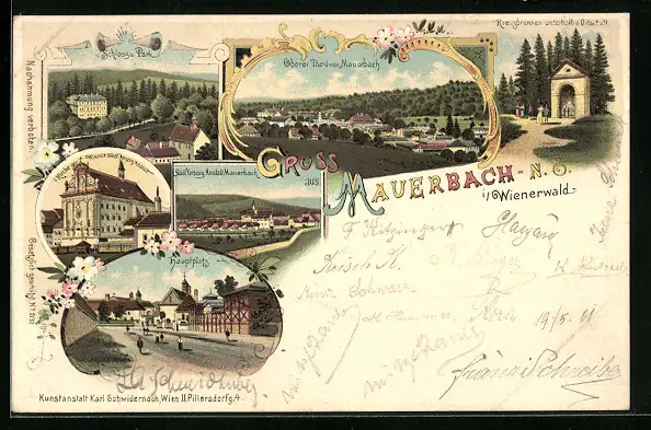 Lithographie Mauerbach i. Wienerwald, Kirche, Hauptplatz, Kreuzbrunnen