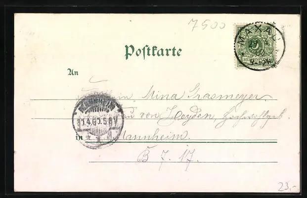 Personenbezogene Daten auf der Rückseite der Karte wurden durch blauen Textmarker unkenntlich gemacht. Die blauen Stellen sind auf die Vorderseite durchgeweicht und wirken sich negativ auf das Postkartenfoto aus