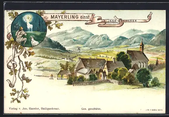 Lithographie Mayerling, Jagdschloss mit Umgebung, Hubertus-Hirsch