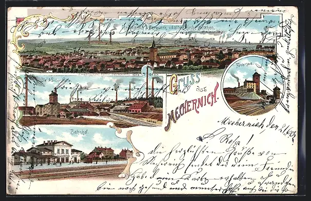 Lithographie Mechernich, Totalansicht mit Bahnhof