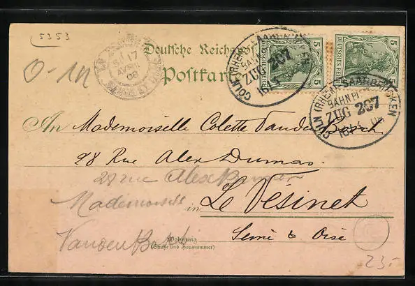 Personenbezogene Daten auf der Rückseite der Karte wurden durch blauen Textmarker unkenntlich gemacht. Die blauen Stellen sind auf die Vorderseite durchgeweicht und wirken sich negativ auf das Postkartenfoto aus