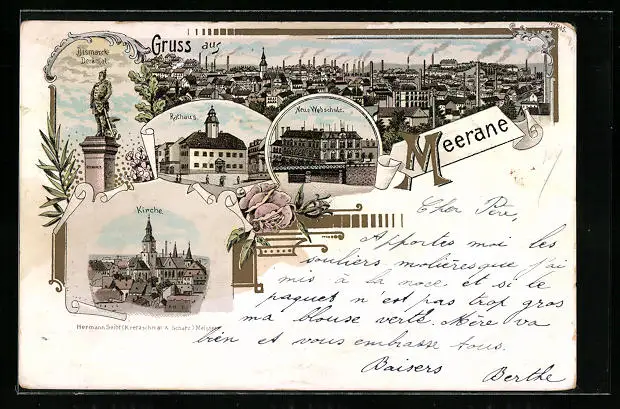 Lithographie Meerane, Panorama, Kirche, Neue Webschule