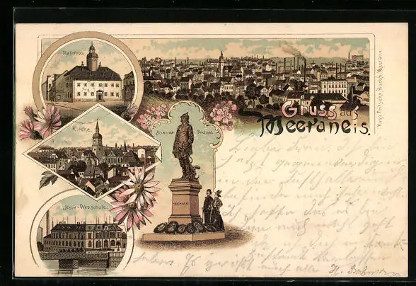 Lithographie Meerane i. S., Ortsansicht mit Kirche, Rathaus