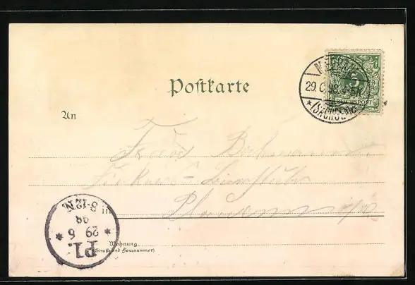 Personenbezogene Daten auf der Rückseite der Karte wurden durch blauen Textmarker unkenntlich gemacht. Die blauen Stellen sind auf die Vorderseite durchgeweicht und wirken sich negativ auf das Postkartenfoto aus
