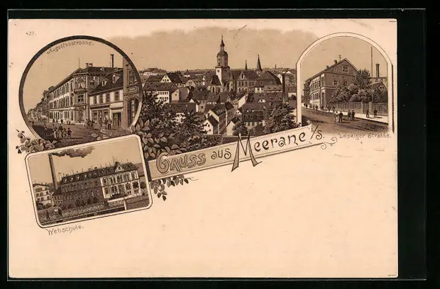 Lithographie Meerane i. S., Webschule, Leipziger Strasse, Augustusstrasse