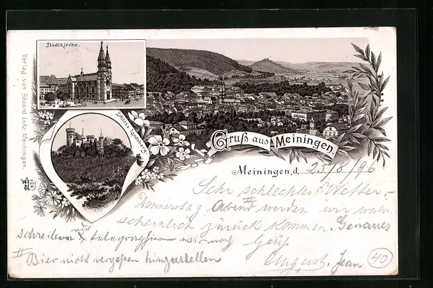 Lithographie Meiningen, Ortsansicht, Stadtkirche und Schloss Landsberg