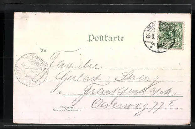 Personenbezogene Daten auf der Rückseite der Karte wurden durch blauen Textmarker unkenntlich gemacht. Die blauen Stellen sind auf die Vorderseite durchgeweicht und wirken sich negativ auf das Postkartenfoto aus