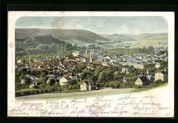 Lithographie Meiningen, Stadttotale mit dem Schloss im Hintergrund