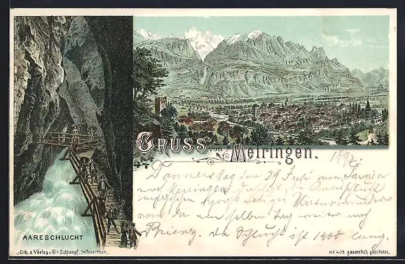 Lithographie Meiringen, Generalansicht, in der Aareschlucht