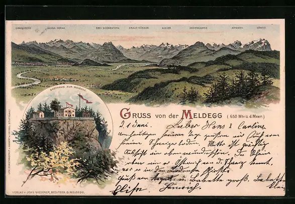 Lithographie Meldegg, Gasthaus zur Meldegg, Panorama mit Alvier, Hohenkasten und Säntis