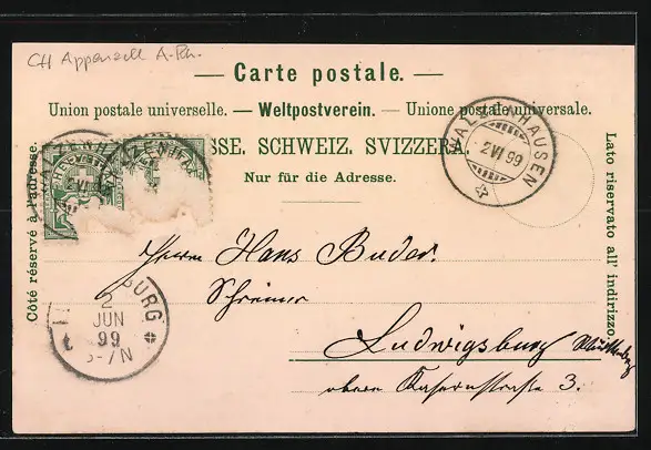 gelaufen 1899, Briefmarke tw. entfernt, rückseitig Oberflächenschaden, Eckknick li. unten, guter Zustand