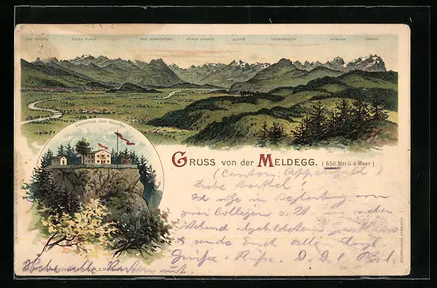 Lithographie Meldegg, Panorama der Region, Gasthaus zur Meldegg
