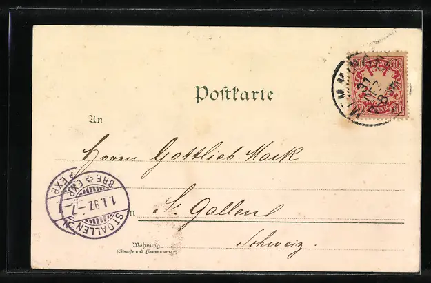 Personenbezogene Daten auf der Rückseite der Karte wurden durch blauen Textmarker unkenntlich gemacht. Die blauen Stellen sind auf die Vorderseite durchgeweicht und wirken sich negativ auf das Postkartenfoto aus