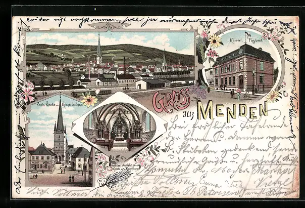 Lithographie Menden, Ortsansicht, Katholische Kirche und Kriegerdenkmal, Kaiserl. Postamt