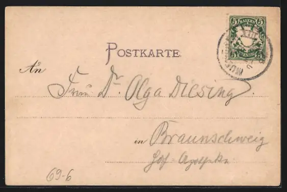 Personenbezogene Daten auf der Rückseite der Karte wurden durch blauen Textmarker unkenntlich gemacht. Die blauen Stellen sind auf die Vorderseite durchgeweicht und wirken sich negativ auf das Postkartenfoto aus