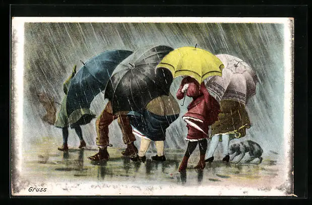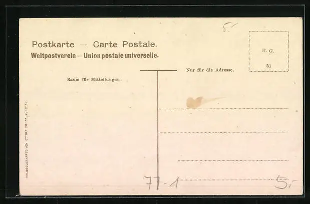 Personenbezogene Daten auf der Rückseite der Karte wurden durch blauen Textmarker unkenntlich gemacht. Die blauen Stellen sind auf die Vorderseite durchgeweicht und wirken sich negativ auf das Postkartenfoto aus