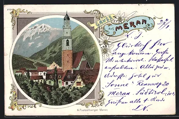 Lithographie Meran, Gemeindekirche mit Blick auf die Dächer der Stadt