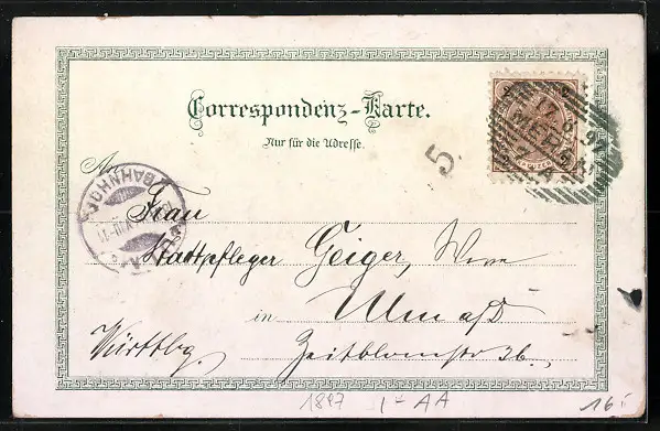 Personenbezogene Daten auf der Rückseite der Karte wurden durch blauen Textmarker unkenntlich gemacht. Die blauen Stellen sind auf die Vorderseite durchgeweicht und wirken sich negativ auf das Postkartenfoto aus