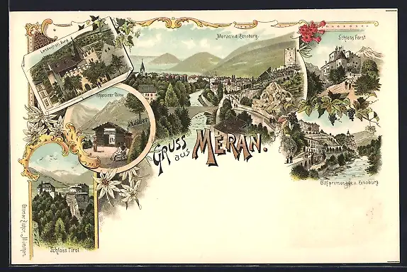 Lithographie Meran, Gilfpromenade und Zenoburg, Tappeiner Weg, Schloss Forst